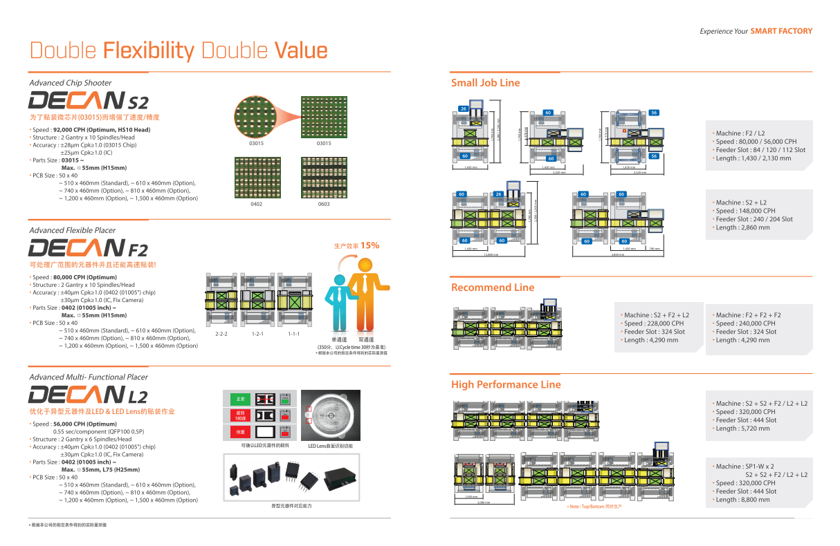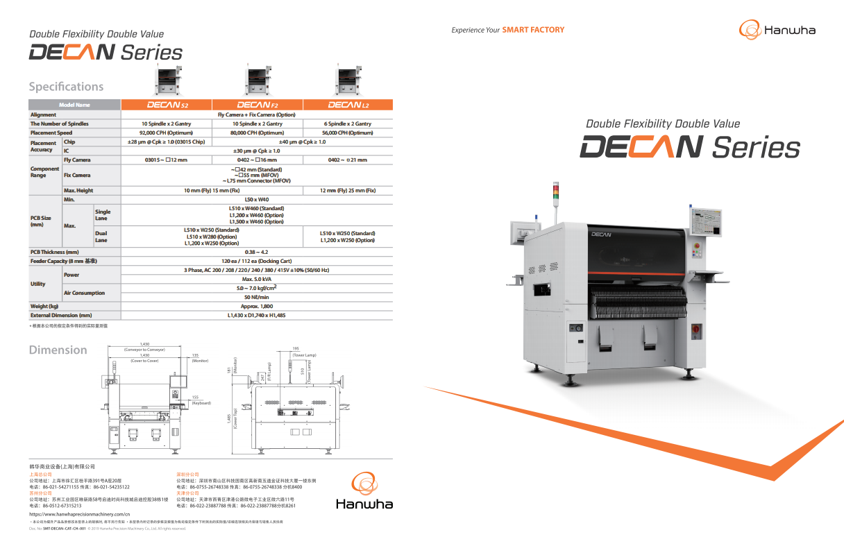 韩华高速泛用贴片机 DECAN L2 HighPerformance - 2 Gantry, Flying VisionHead - 56,000 CPH(Optimum, FS06 Head) High Reliability - 适用Linear Motor,高精度、低噪音 - Accuracy ±40um@ Cpk≥1.0(0402) Flexible Production - Modular Conveyor System -可处理PCB L1,200xW460mm